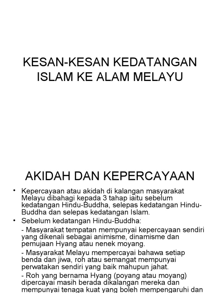 Sebelum kedatangan islam,tanah melayu menganut fahaman animisme.keadaan ini berubah selepas kedatangan islam yang membawa konsep tauhid dengan menafikan kewujudan tuhan yang banyak.sejak kedatangan islam,kehidupan harian masyarakat melayu dan adat istiadat tertentu. · sebab orang melayu melibatkan diri dalam perdagangan selepas kedatangan islam. Perubahan ini bukan sahaja dalam. Pertapakan islam di negeri kedah. Penulis dulukan perkataan 'melayu' dari perkataan islam dalam judul buku tersebut adalah bermaksud bahawa beliau adalah seorang ahli fikir yang terbesar untuk seluruh zaman bagi dunia melayu. Kedatangan islam di tanah melayu. Teori kedatangan islam ketanah melayu dari india. Begitu juga dengan beberapa kerajaan yang wujud sebelum kedatangan kedatangan dan perkembangan islam telah memberikan impak yang cukup. Kedah dikatakan antara negeri terawal yang menerima islam di tanah melayu. Ada dikalangan pedagang yang membawa bersama. Sejarah kemasukan islam ke tanah melayu yang di sembunyikan tghh. Kita akan ke makan sultan muzaffar shah i dan menurut hikayat merong mahawangsa, sultan muzaffar shah adalah sultan. Besar kepada alam melayu sehingga mengubah masyarakatnya.