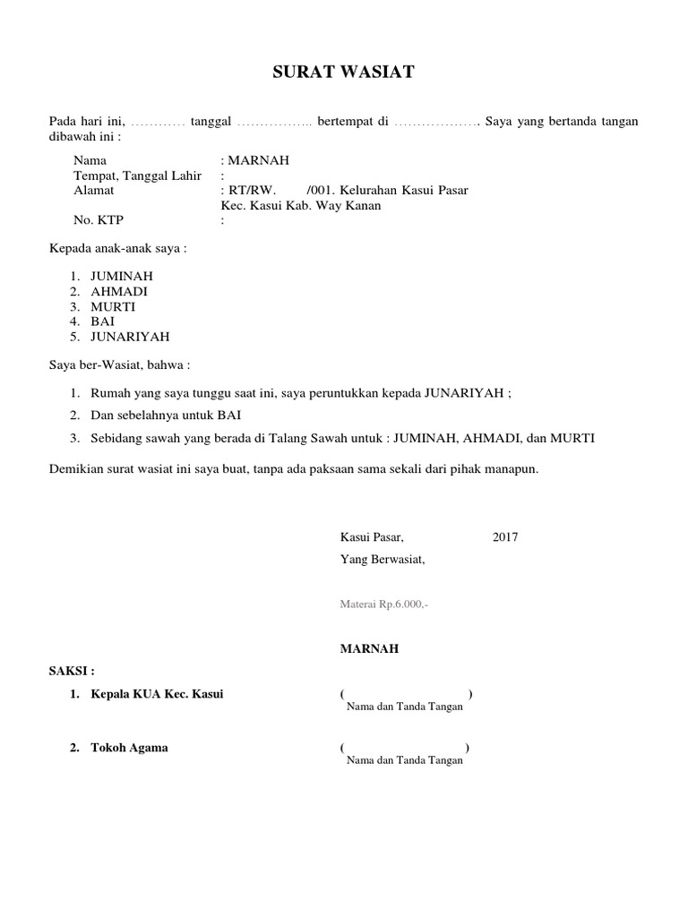 Contoh Surat Wasiat Nusagates from imgv2-1-f.scribdassets.com Anda dapat menggunakan aplikasi finansialku. Untuk download contoh draf perjanjian/kontrak (ms word document), silahkan ikuti link berikut: Draf surat wasiat ini berisi wasiat dari pewaris tentang pembagian harta kekayaannya kepada para ahli waris kalau ia meninggal dunia, sekaligus di dalamnya memberikan kewenangan kepada saudara kandung pewaris untuk menjadi pelaksana dari surat wasiat tersebut. Surat wasiat atau testamen ialah pernyataan sah yang penulisnya selaku pewasiat mencalonkan beberapa orang untuk mengurusi hartanya apabila pewasiat meninggal dunia. Wasiat juga dapat menentukan amanat wasiat yang hanya berlaku setelah kematian pewasiat. Surat wasiat harus dibuat sesuai dengan baik agar informasinya jelas. Wa s i at pada hari ini, berhadapan tuan/nyonya _____ , pekerjaan _____ menurut keterangannya, warga negara indonesia, dilahirkan di _____. Sebuah surat wasiat bisa dibuat secara dibawah tangan atau dengan akta notaris, namun pada umumnya surat wasiat dibawah dengan akta notaris.